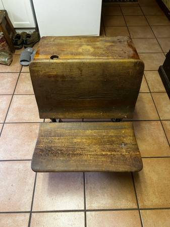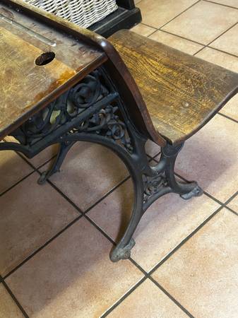Antique school desk with folding seat. Solid wood with cast iron base. Desk top 26" height, 21" wide. Good condition. See pictures. Asking $50.