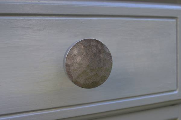 This beautiful desk made by Bassett Furniture features four drawers, and is refinished in tones of gray. Each drawer is also painted with a blended ombré effect. The hardware on the desk showcases dark gray hammered metal knobs and vintage wooden painted pulls with a silver metal back piece. The desk has been sealed to protect it from everyday use and to add a nice shine.