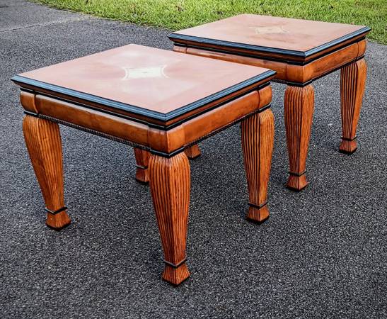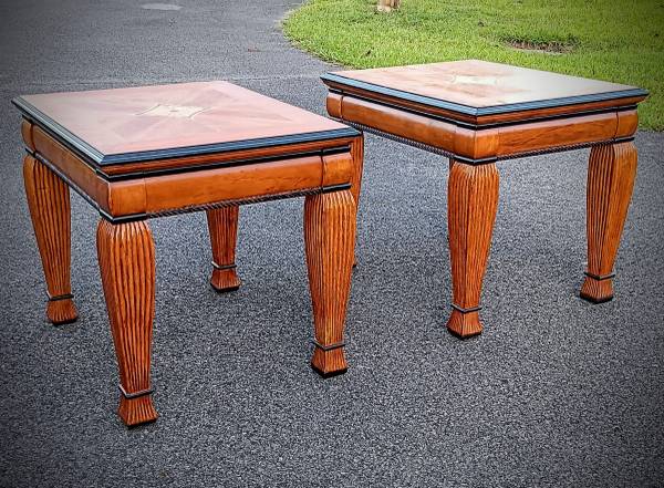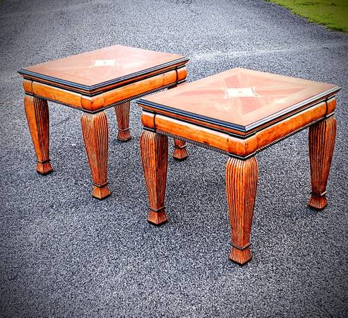 Newly refinished solid wood end tables. Two-tone walnut finish trimmed in high gloss black. 23"wide x 27" deep x 24" tall Delivery available